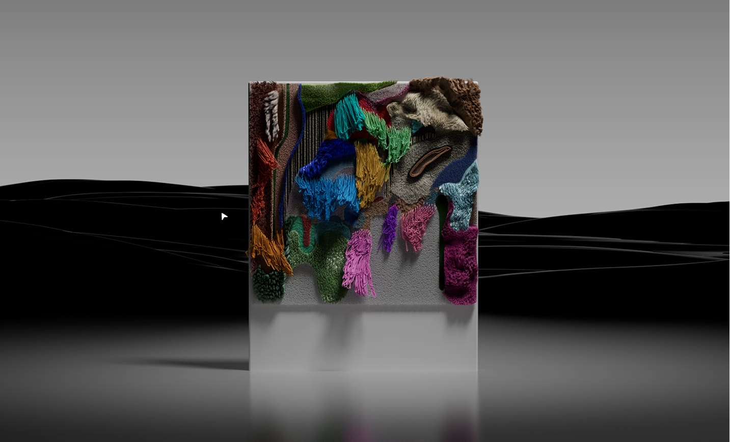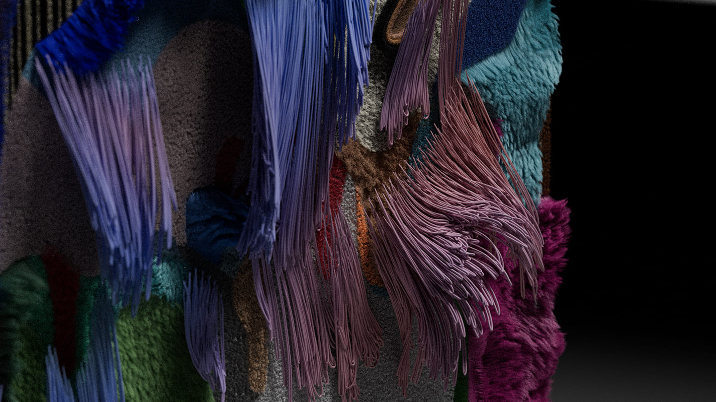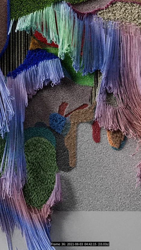 While the physical carpet was hand crafted with a tufting gun, the digital version is a self-growing installation piece, simulated to mimic the effect of real hair growth at an exponential rate.