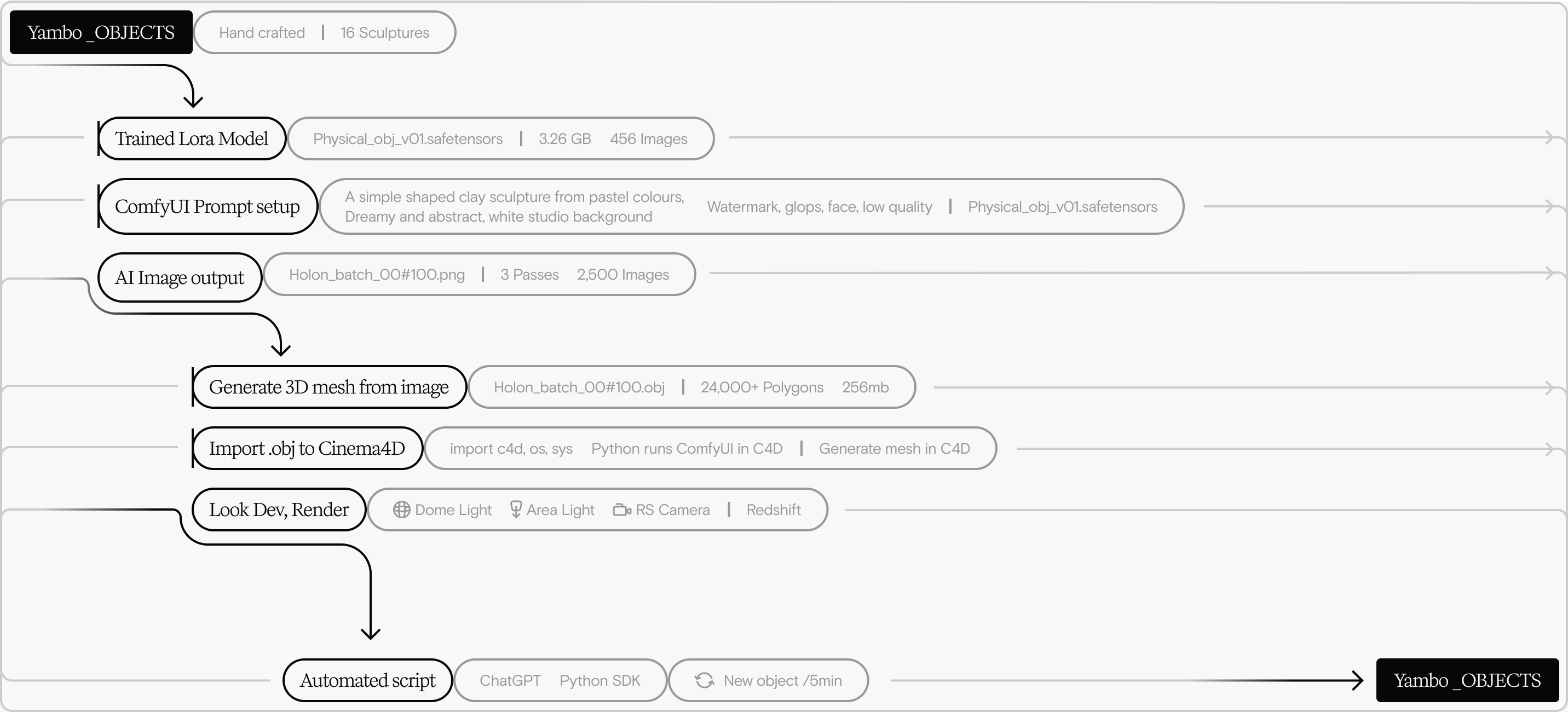 These new sculptures (output in image format) are then passed through ComfyUI, an AI tool that offers granular control over a creative output based on custom ‘workflows’ that enable users to achieve a diverse range of specific end goals, powered by Stable Diffusion and LoRA systems.